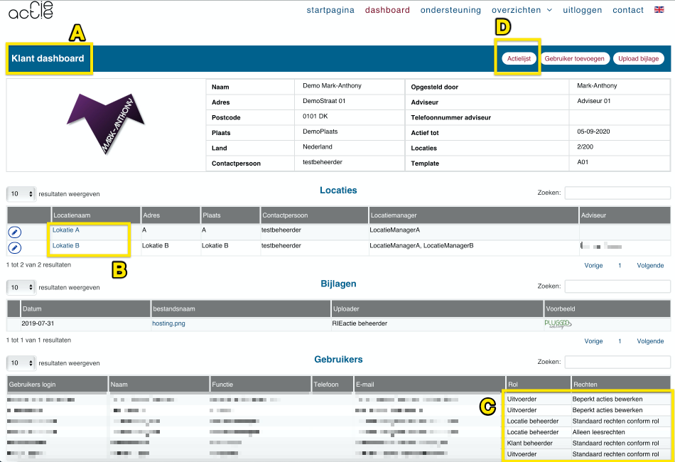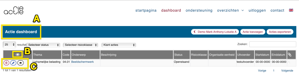 - Via de knop "Actielijst" kun je naar de actiepunten van de RI&E gaan op klantniveau. Actielijsten kunnen gekoppeld worden op klantniveau (hoofdkantoor) of op locatieniveau.
