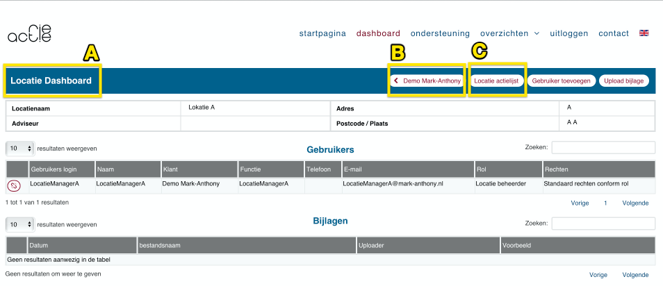 - Via de knop "Locatie actielijst" vind je de actiepunten voor deze locatie.